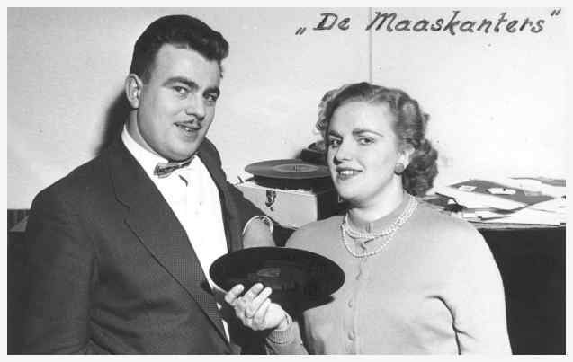 De MaaskantersEind 50er jaren vormden Marina & Wim Kroon het duo de maaskanters Ze hebben toentertijd een plaatje gemaakt. Met de daarbij behorende promotie foto's wilden zij de hitparade (die nog niet bestond) bestormen. Dat deden zij overigens tandenknarsend. Rina zong eigenlijk ook liever ander repertoire. Maar ze konden een liedje op de plaat zetten van Cor Don (NB Rotterdams stadsbeiaardier !!). Het is de hit "Wij zijn echte Rotterdammers". De B kant is "Een zeeman heeft het water lief". Hieronder staan de promotie foto's van het duo. |