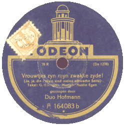 (Ja, ja, die Frau'n sind meine swache Seite) [muziek Austin Egen, tekst G. Hofmann] Duo Hofmann Elkeen hoopt dat 't leven, alles hem zal geven Hoe, dat komt er niet opaan De een die houdt van dansen, die meer van lekker schransen Wat mij kan behagen, kunt u dat nog vragen Ieder meisje voelt het toch terstond Wat me 't meest bekoord is een lach gehoord van een vrouwen mond Want ja de vrouwtjes zijn mijn zwakke zijde Dat is de plek waar men mij treffen kan Kus ik er een dan denk ik aan de tweede En ondertussen kijk ik nummer drie al aan Ach ja de vrouwtjes zijn mijn zwakke zijde Dat is het beste wat mij 't leven gaf En mag're hein die m'eens van haar zal scheiden Hangt het bordje uitverkocht dan zeker op m'n graf Om van haar te houden, gaan de meesten trouwen In de kerk of op 't stadhuis Maar ik zeg met die zaken, heeft geen mens te maken Mag je elkaar niet lijden, ga dan maar weer scheiden Of je beider leven wordt vergald En je zoekt heel gauw dan een and're vrouw die je meer bevalt Want ja de vrouwtjes zijn mijn zwakke zijde Dat is de plek waar men mij treffen kan Kus ik er een dan denk ik aan de tweede En ondertussen kijk ik nummer drie al aan Ach ja de vrouwtjes zijn mijn zwakke zijde Dat is het beste wat mij 't leven gaf En mag're hein die m'eens van haar zal scheiden Hangt het bordje uitverkocht dan zeker op m'n graf En mag're hein die m'eens van haar zal scheiden Hangt het bordje uitverkocht dan zeker op m'n graf | ||